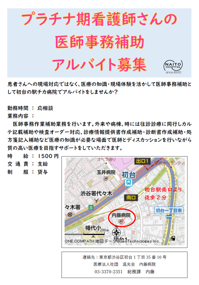 プラチナ期看護師さんの医師事務補助アルバイト募集のお知らせ