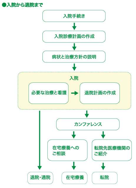 入院にあたっては、お時間をとって、病名・病状と治療方針・入院期間見通しなどを詳しく説明いたします。患者さまの納得を得たうえで治療を進めます。