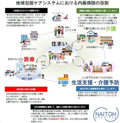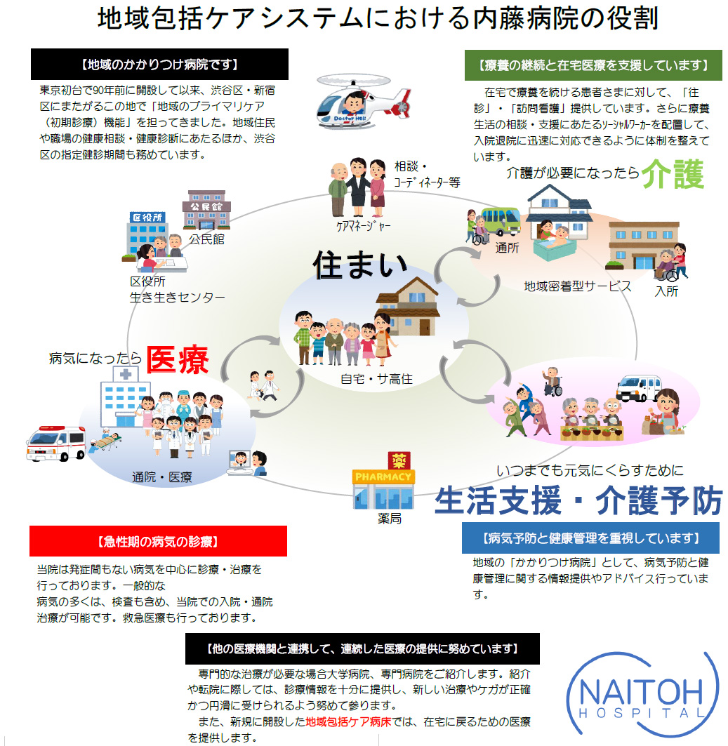 本来は、一般病棟で症状が安定すると、早期に退院をしていただく事となっています。 しかし、在宅での療養に不安があり、もう少しの入院治療で社会復帰できる患者さんの為に当院では「地域包括ケア病床」を準備し、安心して退院していただけるよう支援していきます。